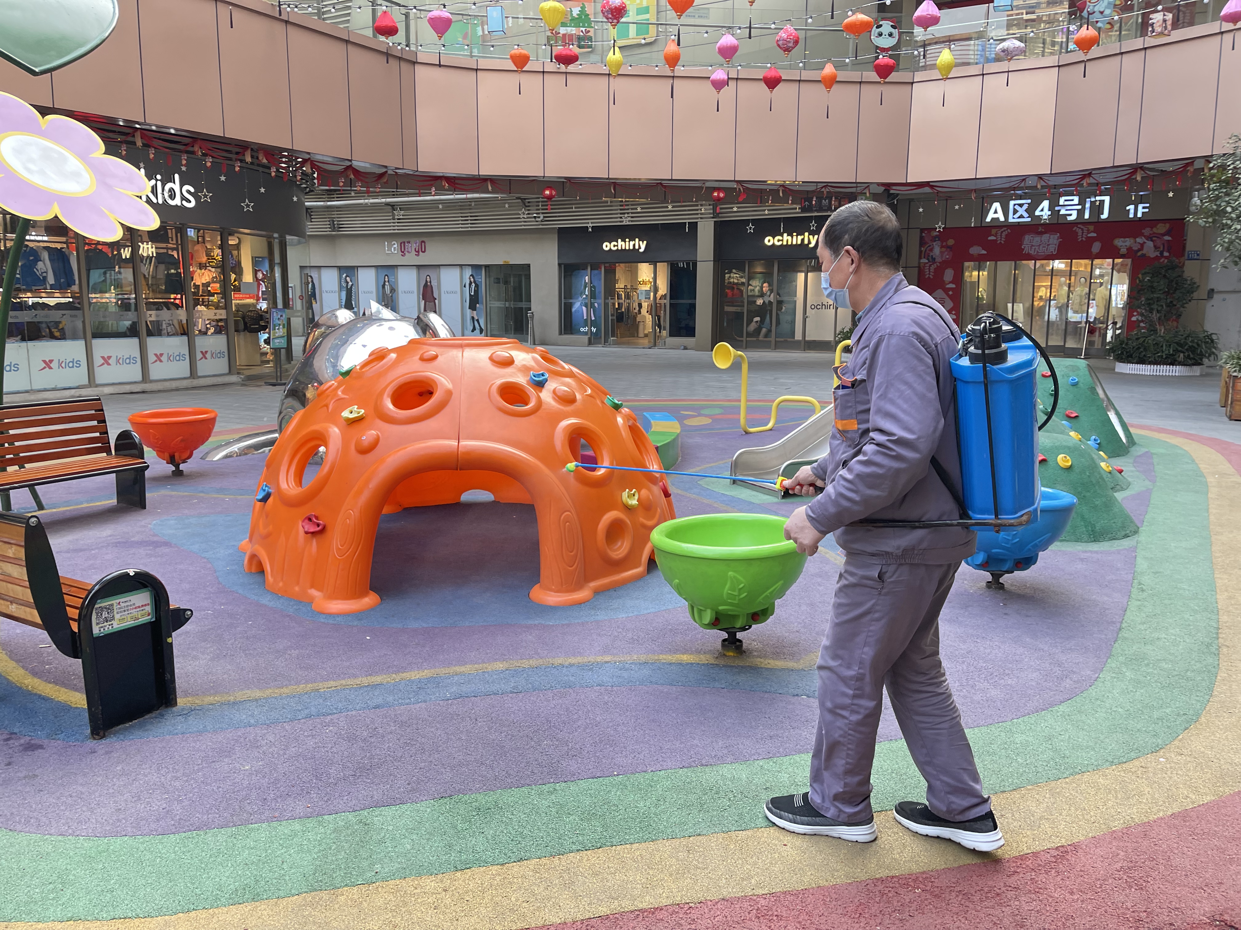 首先,运营部针对流调信息内出现场所迅速进行隔断处理,核对流调信息当日店内值班班次,逐一进行人员排查后配合相关部门进行店铺封控及人员集中隔离处理。同时,物业设备部迅速进行项目全区域严格消杀,除每日对公共区域全面消毒外,针对通道扶手、电梯按钮、垃圾桶等高频使用区域定时定点进行严格消毒,全力保障公共区域卫生安全。