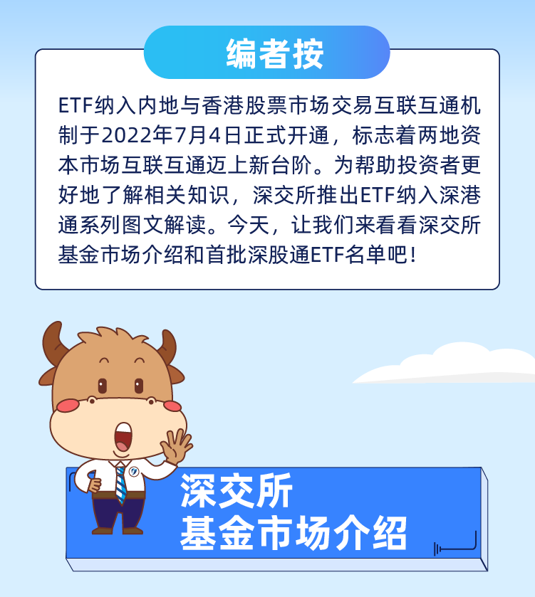 编者按:ETF纳入内地与香港股票市场交易互联互通机制于2022年7月4日正式开通,标志着两地资本市场互联互通迈上新台阶。为帮助投资者更好地了解相关知识,深交所推出ETF纳入深港通系列图文解读。今天,让我们来看看深交所基金市场介绍和首批深股通ETF名单吧!